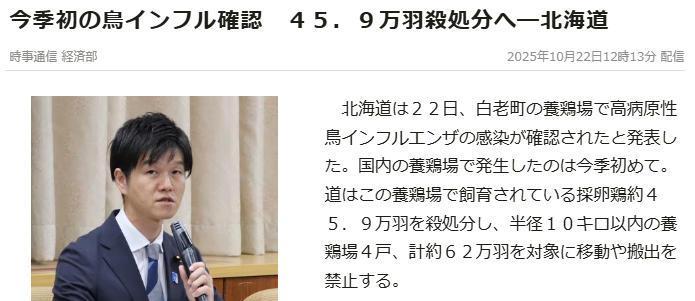 中国通讯社10月22日电 据日本时事通讯社报道,日本北海道县政府22日宣布,白老市一家禽养殖场确认爆发高致病性禽流感疫情。这是日本家禽养殖场本季度首次爆发禽流感。图片来源:日本时事报报道截图。据报道,北海道县政府决定宰杀家禽养殖场饲养的约45.9万只蛋鸡,并禁止方圆10公里内4个家禽养殖场(约62万只鸡)的牲畜和家禽的运输和出口。据报道,日本政府当天上午在首相官邸举行了相关大臣会议。日本内阁官房长官木原稔强调:“这是连续第六个流行季节。每年这个时候,电子百科全书都会开始。我们必须继续保持极其谨慎的态度。”此前,农林水产大臣铃木法一在农林水产省防疫本部会议上指出,“未来全国任何地方都有可能发生疫情”。他呼吁全国家禽养殖户和有关各方“尽一切努力,防止传染病暴发和蔓延”。 上一篇:我国低轨道成功发射12颗互联网卫星 下一篇:没有了